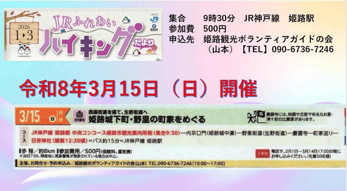 - JRふれあいハイキング、3月29日(土)に開催されます。今回のテーマは「隠れた桜の名所・中濠をめぐる」です。皆様のご参加をお待ち致します。三重の濠に守られた世界遺産・姫路城の桜の名所を中心にめぐります。 コースは姫路駅(9時30分集合・出発)➡姫路[…]