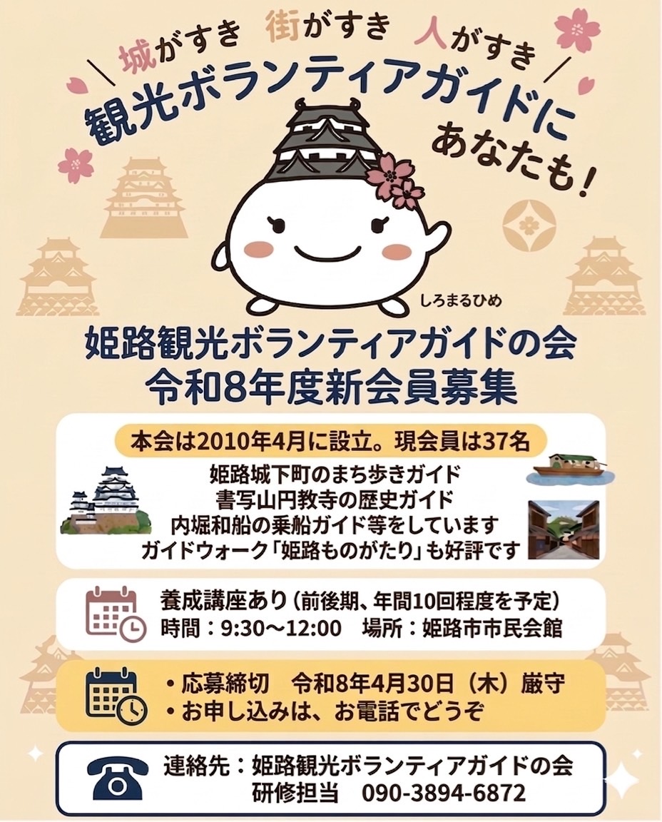 姫路観光ボランティアガイドの会 表題イーグレからの姫路城02無題和船・さくら1-4喜斎門好古園庭園01圓教寺IMG_0001 令和8年度 新規会員募集中 4月4日には「ガイドウォーク姫路ものがたり」を開催予定です 直近に開催予定のイベント情報 【詳細はメニューのイベント情報をクリックください】 slide01slide2slide3042026年4月4日2026年5月2日07 ボランティアガイドの日常活動 P001P002P003P004P005P006P007P008